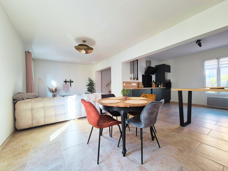 Au 1er étage, vous découvrirez une belle pièce de vie très lumineuse avec une cuisine ouverte équipée et un WC indépendant.
