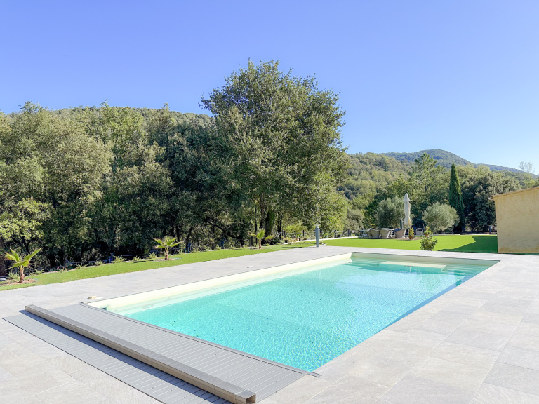 Beau terrain arboré et vue dégagée sur le massif des Maures avec une très belle piscine et son pool house ainsi qu'un terrain de pétanque.