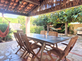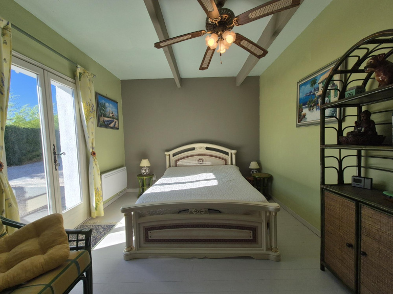 À l'extérieur, côté sud, une terrasse couverte très agréable donnant sur le jardin arboré et ombragé, idéal pour les moments de détente. Sur le côté droit de la propriété, vous profiterez d'une belle piscine coque de 10m x 4,50m, couverte, et de deux abris de jardin, dont un aménagé avec toilettes et douche.